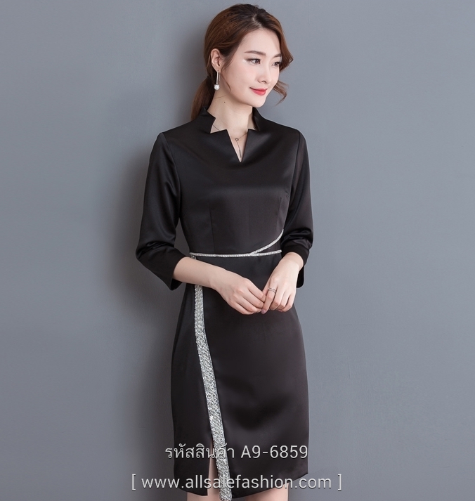 ชุดเดรสทำงานสีดำ ทรงเข้ารูป คอวี แขนสี่ส่วน ช่วงกระโปรงแต่งคริสตรัลสวยๆ แฟชั่นชุดทำงานสวย ดูดี เรียบหรู